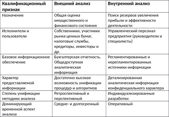 Финансовый анализ может производиться внутренними и внешними пользователями экономической информации. Особенности внутреннего и внешнего анализа сведены в следующую таблицу.