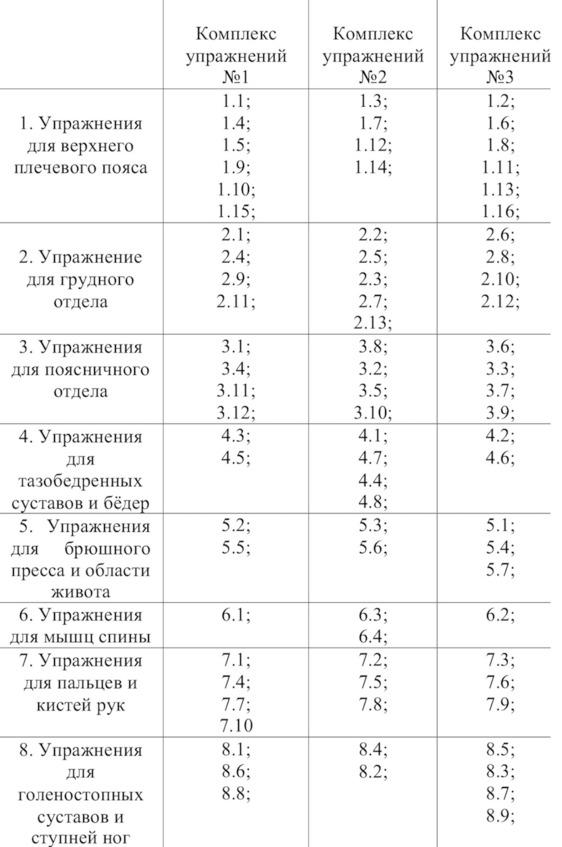 К примеру, Вы хотите найти в книге упражнение К Солнцу. Сначала, в таблице с указанием названий упражнений, Вы находите место расположения искомого упражнения (К Солнцу): Комплекс 1, упражнение №4 (по порядковому номеру сверху вниз). Далее, во второй таблице с указанием числовых обозначений упражнений Вы находите Комплекс упражнений №1 и смотрите числовое обозначение четвёртого упражнения сверху (4 — порядковый номер упражнения в первой таблице), которое и соответствует его названию. В данном случае упражнение К Солнцу имеет числовое обозначение 1.9, обозначающее в свою очередь следующее: раздел 1 (Упражнения для верхнего плечевого пояса), порядковый номер упражнения в разделе — 9 (1.9. Упражнение 9) (стр. 36). Аналогично осуществляйте поиск и других нужных Вам упражнений.