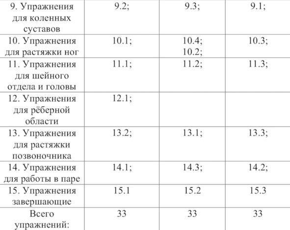 Последовательность выполнения упражнений при выполнении какого-либо из трёх комплексов по 33 упражнения каждый, следует определить для себя индивидуально, в зависимости от ваших особенностей и предпочтений.