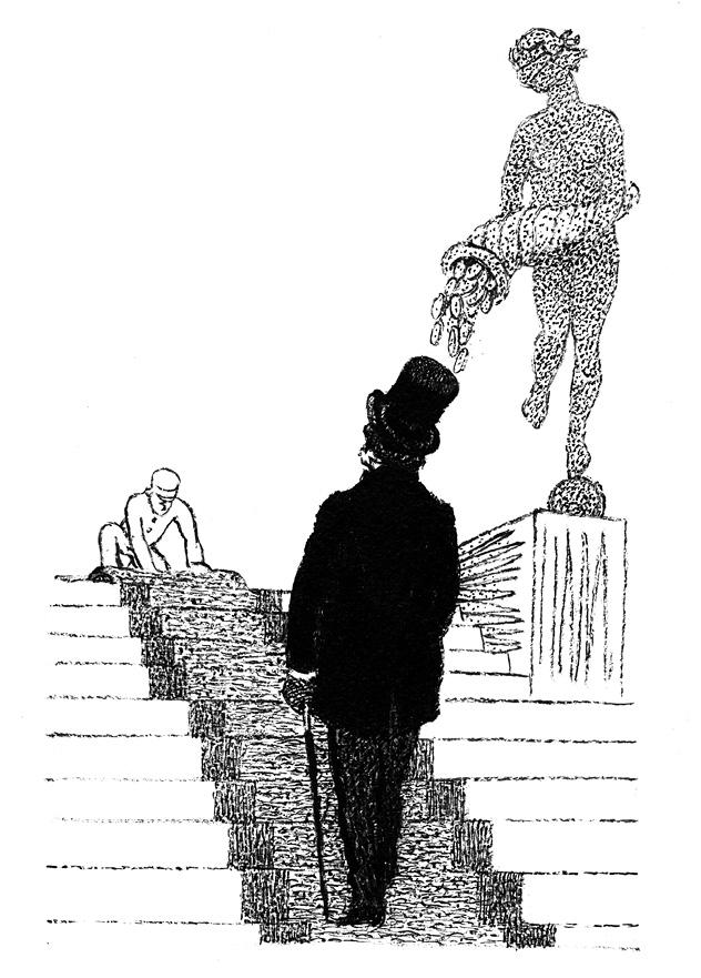 Саккар остановился там и с минуту смотрел на низвергавшиеся потоки дождя, как вдруг до него донесся ясный звон золотых монет, заглушавший шум дождевых капель. Он прислушался. Этот звон, казалось, исходил из самого чрева земли, непрерывный, тихий и музыкальный, как в сказке из «Тысячи и одной ночи». Он повернул голову, осмотрелся и увидел, что находится у дверей дома Кольба, банкира, занимавшегося главным образом торговлей золотом. Покупая золотые монеты в странах, где курс золота стоял низко, он затем переплавлял их и продавал слитки в других местах, где золото было в цене, и с утра до вечера, в дни плавки, из подвала поднимался хрустальный звон золотых монет, которые сгребали лопатой, собирали в ящики, бросали в тигли. Круглый год этот звон стоял в ушах у прохожих. Теперь Саккар радостно улыбался этой музыке, которая была как бы подземным голосом биржевого квартала. Он увидел в ней счастливое предзнаменование.