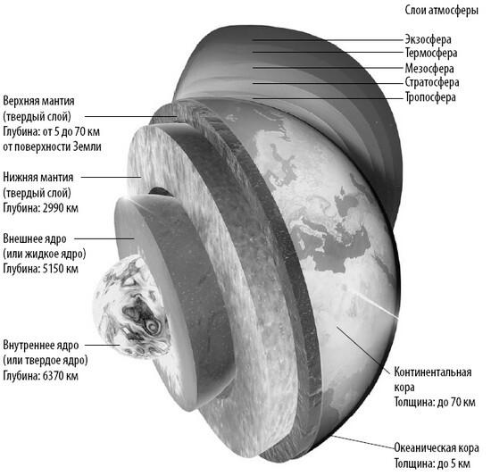 За 4,5 млрд лет Земля в процессе своего формирования разделилась на слои: тяжелые металлы залегают на глубине, более легкие породы – ближе к поверхности. Температура повышается с глубиной, внутри ядра она достигает 4700 °C.