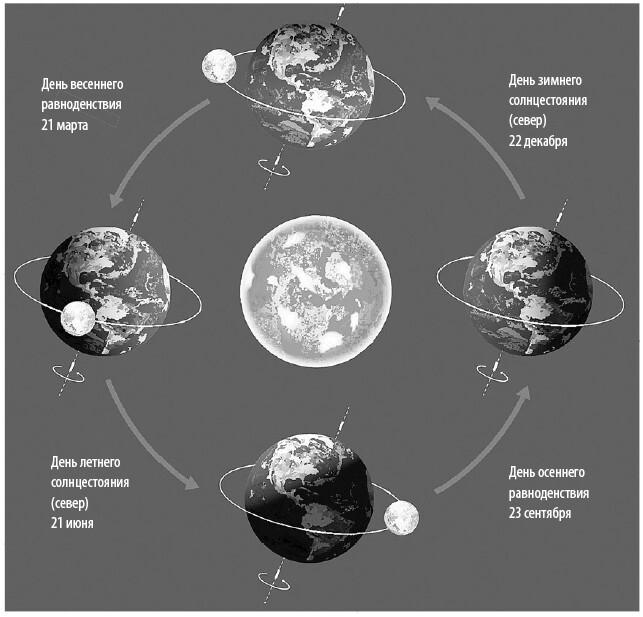 Из-за наклона земной оси происходит смена времен года. Лето приходит, когда Солнце находится над тропиком в вашем полушарии, зима наступает, когда Солнце над тропиком в другом полушарии. Осень и весна – переходные периоды между ними. Дни равноденствия – это два дня в году, один весной и один осенью, когда Солнце стоит прямо над экватором, а ночь и день во всем мире имеют одинаковую продолжительность.