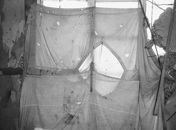 Жилой чердак, пододеяльник закрывает выбитый при артобстреле кусок здания.
