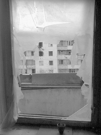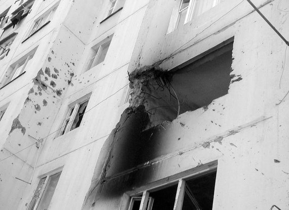 Следы артобстрела на фасаде многоэтажного дома. Район «7-й школы», Грозный, Чечня, 2004