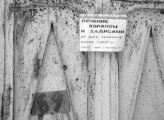 Объявление «Лечение Кораном и хадисами от всех болезней кроме смерти» на прострелянных воротах частного дома. Грозный, Чечня, 2004