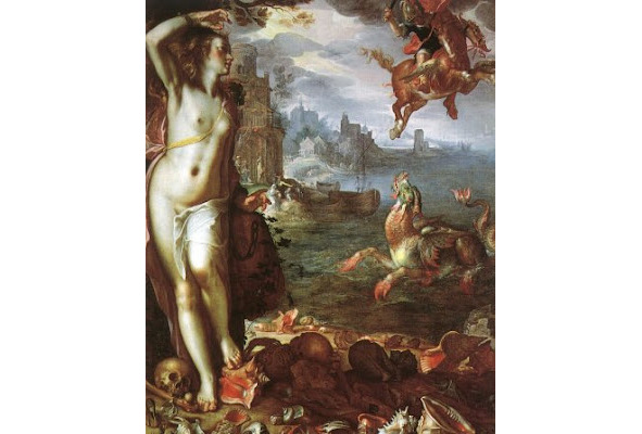 Картина, открывшаяся взору доблестного наездника, была ужасна. В нежную кожу прелестной незнакомки впились тяжёлые оковы, волосы растрепал солёный ветер, а на обнажённую грудь упали несколько капель воды. Что случилось? Оказывается, с минуты на минуту ожидается прибытие морского чудовища с единственной целью — съесть красавицу.