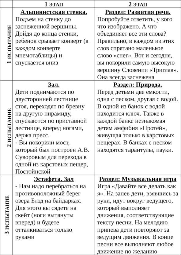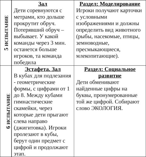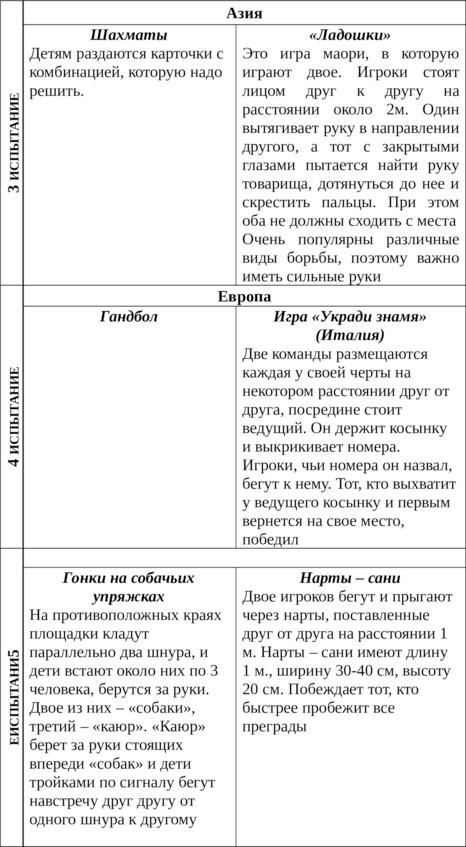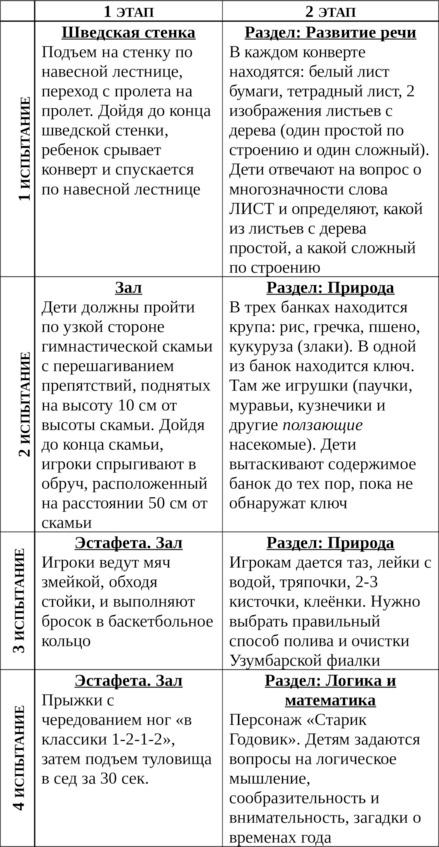 Игра включает в себя 5—7 испытаний, состоящих из 2-х этапов. Первый этап — двигательный, второй — включает в себя задания на развитие творческого воображения, образного мышления, самосознания и т. п. Каждое испытание должно проходить в течение 5—7 минут (возможно использование секундомера, песочных часов и т.п.). Если какой-либо ребенок не выполняет задания одного из двигательных этапов, повтор ему не разрешается. В этом случае команда выбирает одного или двух игроков, которые приходят на помощь, выполняя то же задание, но с усложнением.