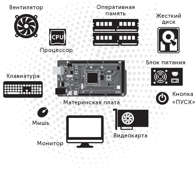 Строители цифрового мира – это программисты, инженеры и математики, дизайнеры и тестировщики. Те, кто пользуются этим миром и проводят в нем время, – его жители. Это называется «цифровым обществом». У всех устройств цифрового мира есть кое-что общее. Все они – фактически компьютеры. Твой смартфон – это мини-компьютер, и планшет – мини-компьютер, и смарт-часы – тоже. Компьютер необязательно должен быть с экраном или монитором – вайфай-роутер тоже своего рода микрокомпьютер. Осознав главное – что все устройства-узлы Глобальной сети устроены внут-ри примерно одинаково, по единым стандартам и топологии, и общаются между собой по одним и тем же правилам, – ты открываешь новый мир для путешествий. Разница между этими узлами-устройствами, как правило, заключается в размере, архитектуре и мощности «железа». «Железо» – это внутренние и внешние компьютерные органы. Например, к железу относятся: процессор, память, видеокарта, материнская плата, клавиатура, сетевая карта.
