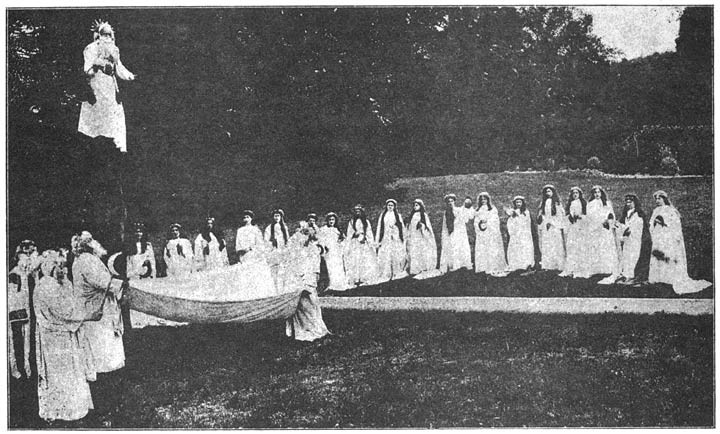 According to old people who remembered the custom in their younger days, they informed me that it was not considered right to throw the mare into the field of a farmer who lived in another parish, or over a river or even a brook. I was also informed by some that it was not allowable to bear it up hill to a field which stood on a more elevated ground. It was often the custom especially in Carmarthenshire and Pembrokeshire, instead of throwing it into a neighbour’s field, to convey it home to the house, that is to the house of the farmer himself who had finished his harvest that day. The honour of bearing it home in this manner belonged to the one who had succeeded in cutting it, but the difficult part of it was how to take it into the house dry, for it was absolutely necessary that it should be taken into the house without being wetted. And this was not always an easy task as the servant maids at the house carefully stored water in buckets and pans ready to throw over the man and his Caseg Fedi at his entrance; and sometimes he would have a pretty rough time of it. In order to prevent this the man tried to appear as indifferent as possible so as not to be suspected by the girls. Consequently, he carefully hid the mare under his clothes, but in spite of everything he was sometimes stripped of some part of his garment or deluged with water. But when he could succeed in bringing it into the house dry and hung it up without being observed, the master had to pay the bearer a shilling or two, or to give him plenty of beer. But the master was spared to pay the shilling if the girls could succeed in wetting the mare. These curious old customs have been discontinued, but it is still the practice with some to bring a handful of corn into the house tied up under the name of the mare. At supper that evening there was a good deal of fun. John Wright, Bailiff of Stackpole in Pembrokeshire, refers to the custom as follows when writing to his master, Mr. Pryce Campbell, August, 1736:—“Whilst I was abroad (he had been in Cardiganshire) the harvest people cut the neck, and, notwithstanding all the stones about the court (this house was being rebuilt), would have a dance. The dance was the Three Shopkins. There was a noble feast, the bill of fare was as follows:—Four quarters of mutton, a side of bacon, a piece of beef weighing half a hundred-weight, twelve gallons of Buding besides, cabotch and other greens. They seemed very well pleased with their entertainment.” It was customary in some places to have a harvest queen attired in white gown decorated with ears of wheat and roses. In other places a sheaf of wheat was decorated with ribbons and taken home to the farm on the top of the last load, when the horses were also very gaily decked.