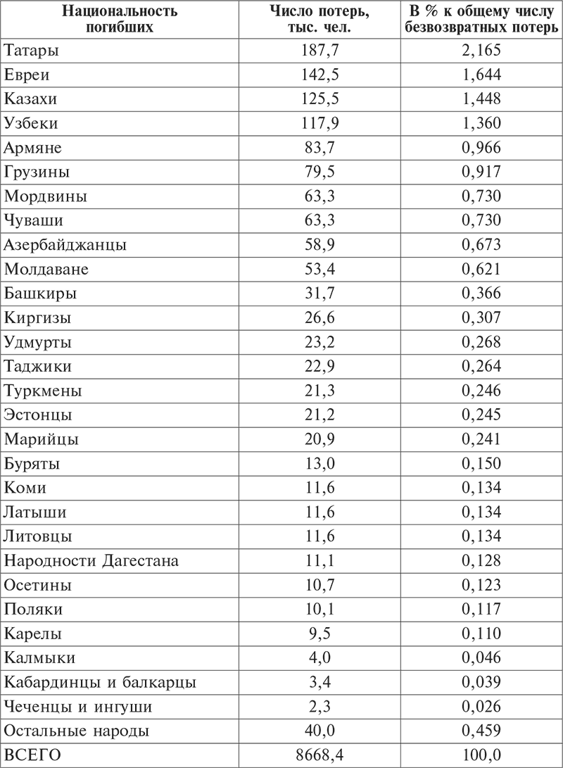 В числе прочего авторами была предложена раскладка безвозвратных потерь по национальностям, которая переходила в каждое новое издание книги и много лет некритически тиражировалась различными исследователями[75], в том числе какое-то время – и автором этих строк.