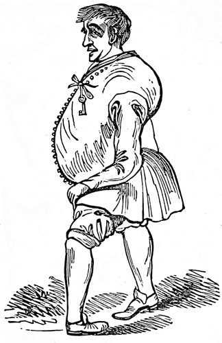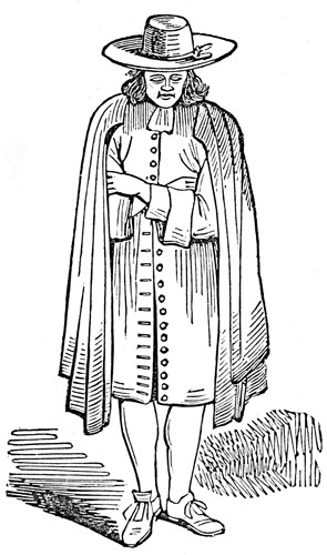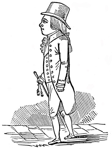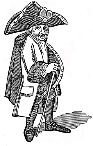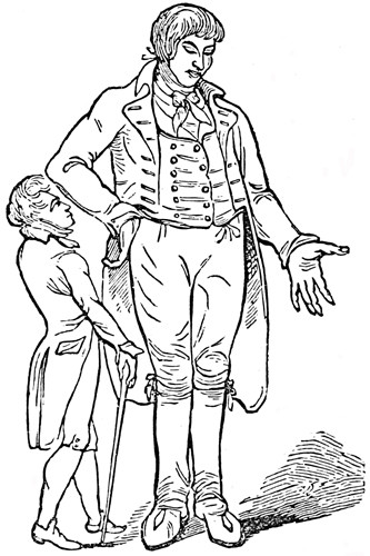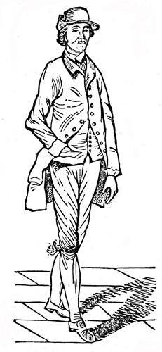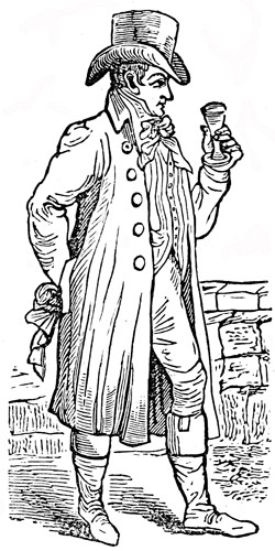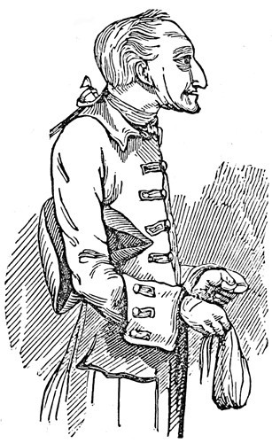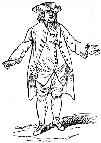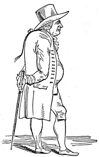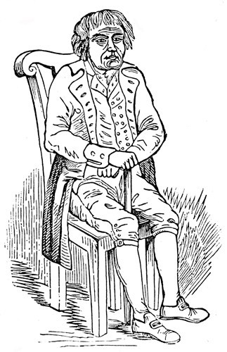 When he was somewhat advanced in life, he dismissed his fox-hounds, retrenched his expenses, and lived in the most parsimonious manner. Riches now rolled in upon him like a torrent; at the same time, his mean, miserly propensities increased. When in London, he would walk home in the rain, rather than pay a shilling for a coach; and sit in his wet clothes, rather than have a fire to dry them. On one occasion, he wore a black wig above a fortnight, which he picked out of a rut in a lane, and which had probably been discarded by a beggar. While the black, stray wig was thus atop of his own gray hair, he one day tore his coat, and, in order to supply himself, resorted to an old chest of Sir Jervaise, his uncle's father. From this, he took the first he came to, which was a full-dress, green, velvet coat, with slashed sleeves. In this attire, he sat down to dinner: not even the solemn severity of his poor old servant could resist the ludicrous effect of his appearance.