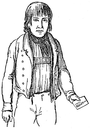 His height was seven feet two inches and a half: his head, and the upper parts of his body, were monstrous. His arms were of such length as to touch his knees, when he stood erect. His whole weight was 360 pounds. At this period he was twenty-four years old. The annexed sketch gives a good idea of his appearance.