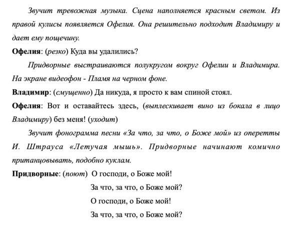 Подробная литературная разработка замысла с полным текстом действующих лиц, описанием характеристики сцены и музыкального оформления (прописанные все реплики персонажей и минимально-необходимые ремарки по действию).