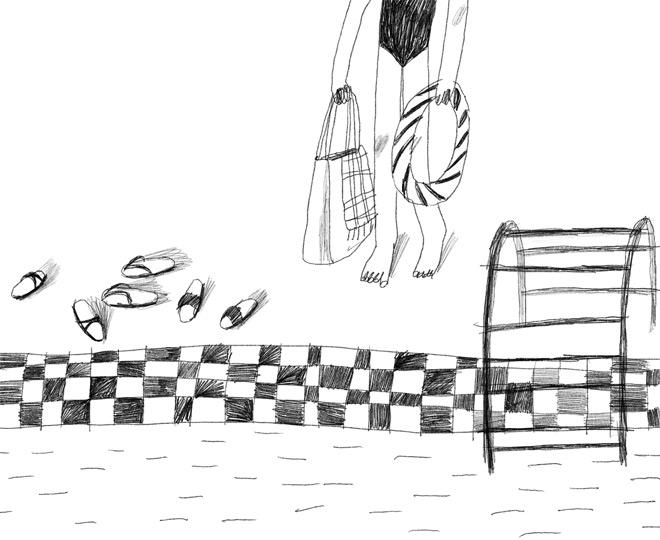 Мы уже бывали здесь раньше с родителями. Первое, что видишь, когда попадаешь на территорию открытого бассейна, — это огромный зеленый луг. За ним идут ванны. Сначала для маленьких, потом ванна для не умеющих плавать, с горками. Дальше ванна для прыжков в воду и ванна с пятидесятиметровыми дорожками.