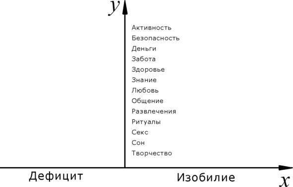 Visually, scarcity and abundance can be placed on the chart, where to the right of zero along the X axis there is abundance, and on the left — Deficiency.