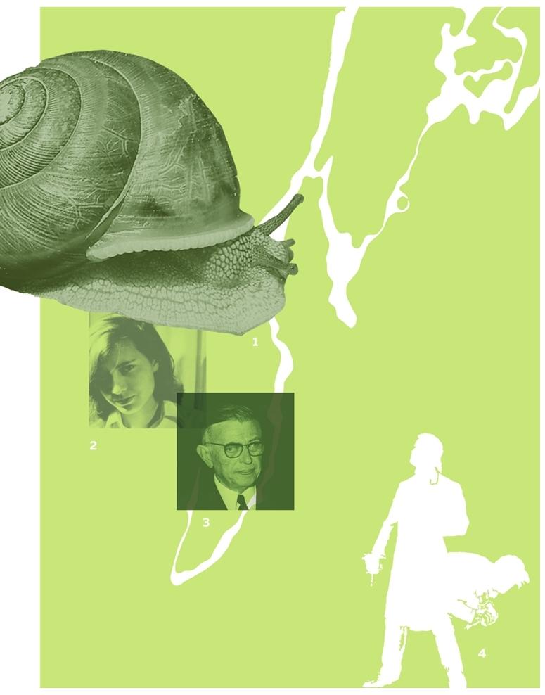 Рисунок 5. Американская писательница Патриция Хайсмит (2) любила улиток (1). Французский философ Жан-Поль Сартр (3), напротив, ненавидел слизь. В романе Роберта Льюиса Стивенсона «Странная история доктора Джекила и мистера Хайда», 1886 (4), добро и зло борются в человеке, как показано на театральном плакате