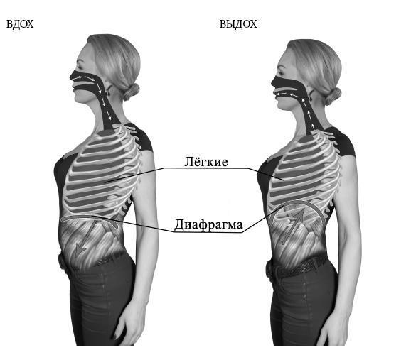 3. Диафрагмальное дыхание (дыхание животом, нижнее дыхание, фонационное дыхание). На вдохе диафрагма, сокращаясь, уплощается и опускается. Нижняя часть грудной клетки увеличивается в объеме, брюшная стенка выпячивается. На выдохе мышцы живота сокращаются, за счет этого живот «вдавливается». Диафрагма при этом типе дыхания играет основную роль. В нижней части легких это обеспечивает полноценный газообмен. При таком типе дыхания легкие получают больший объем воздуха, мы можем регулировать процесс выдоха. Именно диафрагмальное дыхание наиболее эффективно при звукоизвлечении.