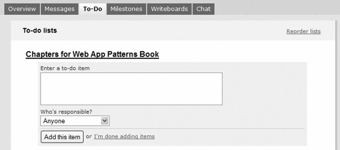 Рис. 2.22. В сервисе Basecamp для усовершенствования процесса смены заданий применяются настройки по умолчанию. Когда пользователи создают список заданий («To-do»), на странице отображается форма Enter a to-do item (Введите задание), и пользователям не приходится щелкать по элементу Add a To-Do (Добавить задание)