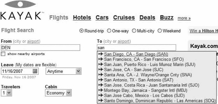 Рис. 2.25. На сайте Kayak применяется шаблон AUTOSUGGEST/ AUTOCOMPLETION, предлагающий пользователю выбор из нескольких вариантов, чтобы сократить количество возможных ошибок