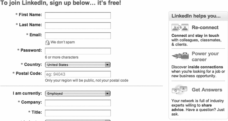 Объедините элементы формы в группы в зависимости от их функций, например, адрес доставки, адрес выставления счета, контактная информация и т. д. Убедитесь, что порядок расположения элементов в каждой группе соответствует представлению пользователей о том, в каком порядке нужно вводить информацию. Например, для пользователей из США расположите элементы формы, относящиеся к информации об адресе, так, чтобы сначала нужно было вводить название улицы и дом, затем город, а только затем название штата и индекс, или, например, при создании учетной записи, сначала просите ввести имя пользователя (или адрес электронной почты), а затем пароль (рис. 2.13).
