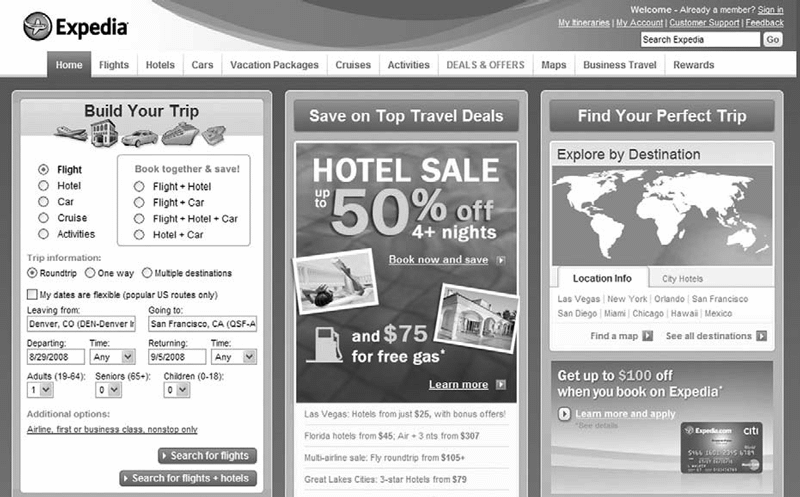 Рис. 1.2. Пользователи могут искать варианты туристических путевок и осуществлять бронирование билетов с помощью веб-приложений, таких как Expedia