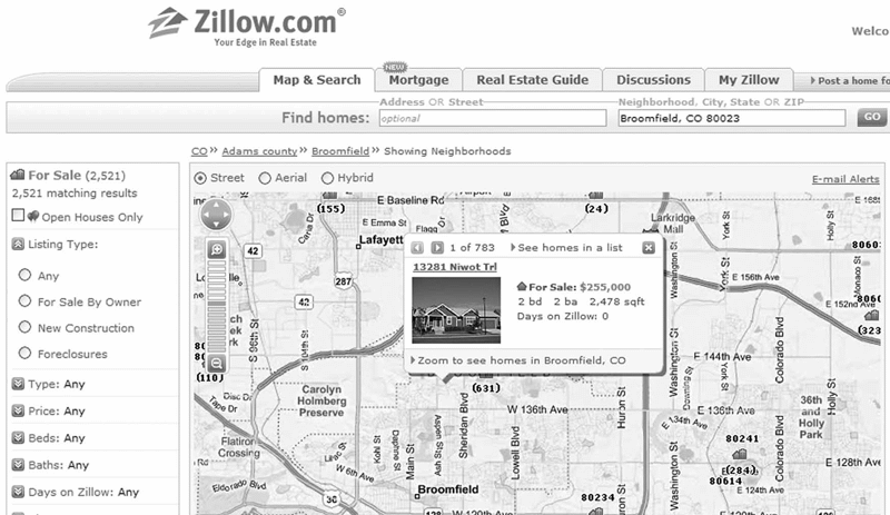 Рис. 1.3. Пользователи могут найти продающийся дом, узнать его стоимость и увидеть, какие еще дома выставлены на продажу в этом районе. Все это можно сделать на таких сайтах, как Zillow.com