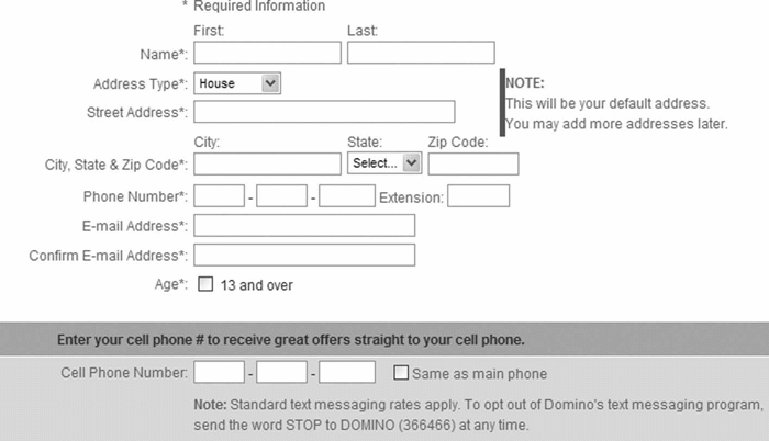 Рис. 2.19. На сайте Dominos обязательные поля обозначены красными звездочками, так пользователю становится понятно, что номер мобильного телефона вводить необязательно. Также указано, какие преимущества пользователь получит, если укажет свой мобильный телефон
