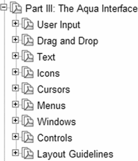 Руководства по разработке и стилю оформления обычно довольно объемные и сложные в использовании, поскольку для реализации одного способа взаимодействия обычно необходимо, чтобы разработчики пользовательского интерфейса ознакомились с несколькими пунктами документа. Например, руководство по проектированию пользовательских интерфейсов от компании Apple: «Human Interface Guidelines» – документ объемом почти в 400 страниц, и чтобы создать диалоговое окно с элементами управления, разработчику пришлось бы ознакомиться с несколькими пунктами части номер 3, называющейся: «Part III: The Aqua Interface» (рис. 1.8), которая содержит примерно 250 страниц, посвященных этому вопросу.