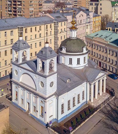 О деревянной церкви на этом месте известно еще с 1560 года. Современное здание построено в 1791 году французским архитектором Николя (Николой) Леграном в классическом стиле (колонны, портик, пилястры и т. д.). Особенность храма – две колокольни, что является большой редкостью для московского храмового зодчества, но его строил француз, потому и две башни-колокольни возведены на европейский манер.
