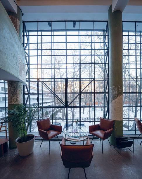 В коммунальном корпусе раньше располагались места для отдыха и столовая. Сегодня здесь работает кафе, а в летнее время открыт выход на крышу. На момент написания книги доступ в кафе и на крышу возможен для жителей дома и держателей карты «Гараж». Зато в бывшей Прачечной (д. 25–27с12), отдельном корпусе ближе к Садовому кольцу, открылся ресторан, куда может зайти любой желающий.