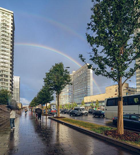 По наземному пешеходному переходу переходим Садовое кольцо и попадаем на Новый Арбат. Перед нами первый в СССР микрорайон нового типа, построенный в 1962 – 1968 годах в стиле модернизм. Среди архитекторов проекта – создатели высотки на Кудринской площади Михаил Посохин и Ашот Мндоянц, а образцом послужили идеи советских конструктивистов, а также Ле Корбюзье.