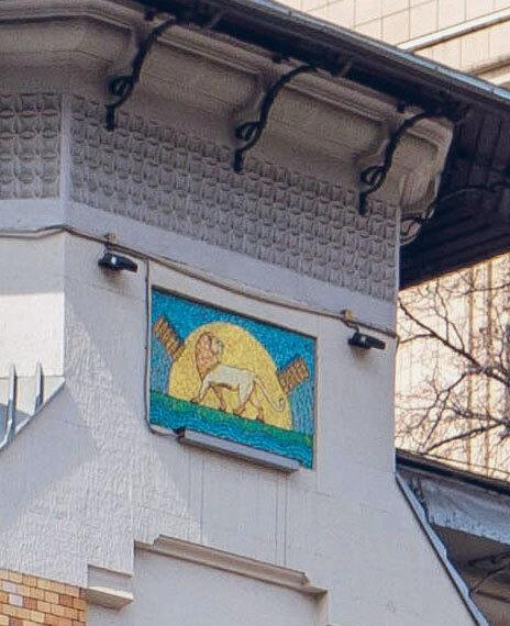 После завершения строительства он был продан фабриканту Отто Листу. Про модерн я подробнее расскажу на нашем маршруте № 2. Здесь же обращу ваше внимание лишь на его основные элементы: окна различной формы, изогнутые линии, сложные узоры, растительный декор, отсутствие симметрии, использование мозаики для украшения фасада. Над окном дома, находящемся на фасаде, перпендикулярном Глазовскому переулку, можно увидеть льва на желтом фоне в голубом прямоугольнике: Лев Кекушев отмечал и украшал почти все свои здания фигурой льва. Над главным входом помещено панно с изображением подводного царства работы еще одного известного архитектора, мастера модерна Вильяма Валькота – его авторство подтверждают буквы W. W.