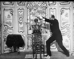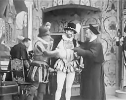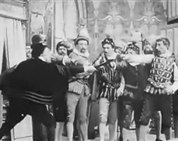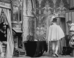 В следующей сцене король собирает в Новом кабинете Шато де Блуа свой отряд гасконцев, известных нам по роману Александра Дюма «Сорок пять» – правда, в фильме их всего дюжина, но для общего плана раннего немого кино и этого многовато. Он вдохновляет «сорок пять» на убийство, раздает им кинжалы и заставляет их поклясться на кресте. Все движения Генриха III (Шарль ле Баржи) и его телохранителей прекрасно срежиссированы, они работают, как единый организм. Гасконцы уходят, король прячется за занавеску… Эта сцена – первый переломный пункт истории, из нее мы узнаем, что антагонист главного героя не просто «собирается сыграть злую шутку» – он тщательно подготовил убийство, заглавное событие фильма. Первый переломный пункт – это первый серьезный кризис фильма, он разделяет первый и второй акт. Герцог мог не ходить на Совет, король мог решить дело иначе, но теперь это уже невозможно – история приобрела заданное направление.