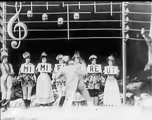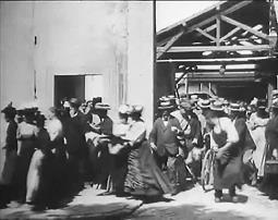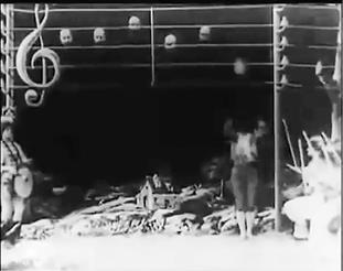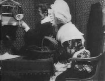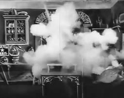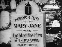 Наконец, картина «Злоключения Мэри Джейн» Смита (1903 г.) – классика черной комедии, которая отличается сложным монтажом – как внутриэпизодным, так и межэпизодным. Сначала мы видим героиню фильма, домохозяйку Мэри Джейн (Лаура Бэйли из «Позволь мне снова помечтать») на общем плане в кухне – она чистит ботинки (средний план лица Мэри Джейн, измазанного ваксой), пытается раздуть огонь в очаге (общий план) и решает использовать керосин (опять средний план, хорошо видна надпись «КЕРОСИН» на бутылке), но происходит взрыв (общий план). Следующая сцена – мы видим общий план крыши дома, Мэри Джейн вылетает в трубу, чуть погодя сверху валятся ее останки. Следующая сцена открывается крупным планом кладбищенского памятника, на котором значится: «Здесь лежит Мэри Джейн, которая разжигала очаг керосином. Мир твоим кусочкам». Общий план, к могиле подходят четыре скорбящие женщины – и в ужасе разбегаются, когда из могилы поднимается дух Мэри Джейн (двойная экспозиция) в поисках бутыли из-под керосина.