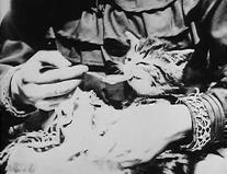 Сцена Королевского Совета, в центре внимания – герцог Гиз. Ему нездоровится, он едва не падает в обморок, у него идет носом кровь – но и на это дурное предзнаменование, которое, очевидно, предвещает кровь, которая еще прольется, наш герой не обращает внимания. Гиза усаживают, приносят ему какое-то лакомство для восстановления сил (из истории мы знаем, что это были не то сушеные сливы, не то виноград), он вытирает нос платочком. На девятой минуте фильма – точно в его середине – входит госсекретарь и со всеми подобающими почестями передает Гизу личное приглашение от короля. Это центральный переломный пункт фильма, его главный кризис. Если до него герой мог бы покинуть Совет, сославшись на болезнь, то теперь он уже не может не пойти в кабинет короля, где дежурят убийцы! Сторонники Гиза, один из них в кардинальской мантии – очевидно, это брат главного героя, Луи де Гиз, архиепископ Реймсский и кардинал Лотарингский – пытаются последовать за герцогом, но стражник, безмолвно присутствовавший все это время в зале Совета, останавливает их.