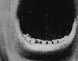 Разберем также насыщенный спецэффектами фильм Джеймса Уильямсона «Большой глоток» (1901 г.). Сам Уильямсон так описал свой фильм в каталоге: «Я не хочу, я не хочу, я лучше съем аппарат!» Читающий джентльмен, которого мы наблюдаем с точки зрения оператора, замечает нас и выразительно протестует против съемок. От подходит все ближе к нам, перемещаясь из общего плана в сверхкрупный – в кадре остается видна только его голова и наконец – только его открытый рот, в который мы проваливаемся вместе с камерой. Чтобы удержать актера Сэма Далтона в фокусе, Уильямсон несколько раз останавливал съемку и, пока Далтон неподвижно стоял, менял настройку. План открытого рта актера Уильямсон смонтировал с черным фоном, на который наложил кадры с падающей камерой и «оператором», затем следовал план активно жующего актера, удаляющегося от камеры (Рисунок 17).