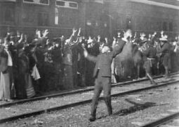 Несколько следующих сцен сняты целиком на натуре. Сначала поезд останавливается, и бандиты заставляют машиниста отцепить паровоз. Затем бандиты грабят пассажиров, выстроенных вдоль остановленного поезда. Один из пассажиров пытается совершить немотивированный побег, бандиты стреляют в него, и он, страшно переигрывая, валится на железнодорожную насыпь, окончательно восстанавливая зрителей фильма против грабителей (Рисунок 19).