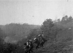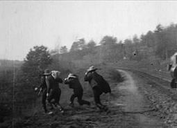 Бандиты уезжают на отцепленном паровозе, но мы не следим за ними на протяжении всей поездки. Сцена завершается, а в следующей сцене паровоз уже останавливается – правда, очевидно, что две эти сцены сняты на одном и том же отрезке пути – и бандиты покидают его. В этой сцене камера, следя за бандитами, впервые начинает двигаться (Рисунок 19)! Затем мы видим, как грабители уходят через лес, перебираются через ручей и садятся на заранее заготовленных лошадей.