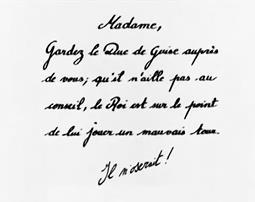 Входит паж, он передает хозяйке записку, в которой значится: «Мадам, удержите герцога де Гиза у себя, чтобы он не ходил на Совет, король собирается сыграть с ним злую шутку». Это инициирующий фактор фильма, в этот момент мы узнаем (если не считать заглавных титров фильма, в которых открытым текстом написано «убийство»), в каком направлении будет развиваться история.