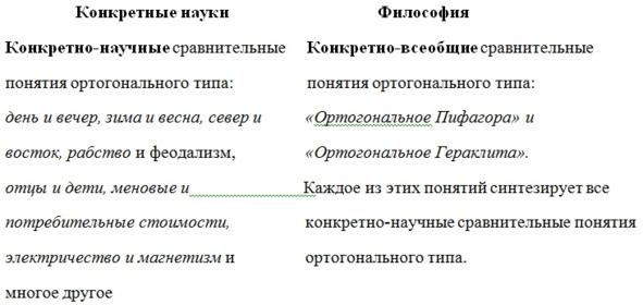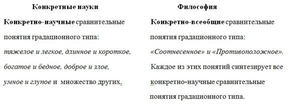 Причем конкретно-научные сравнительные понятия, позволяют перевести гуманитарные дисциплины с уровня мнений, на уровень расколотого по предметам конкретно-научного объективного знания, как это имеет место в естественных науках, тогда как конкретно-всеобщие сравнительные понятия, вбирая в себя аналогичные конкретно-научные понятия разных видов, собирая знания воедино, поднимают философию на уровень кумулятивной верифицируемой строгой науки. Иначе говоря: разум раскалывает знания на части, а мудрость собирает их воедино.