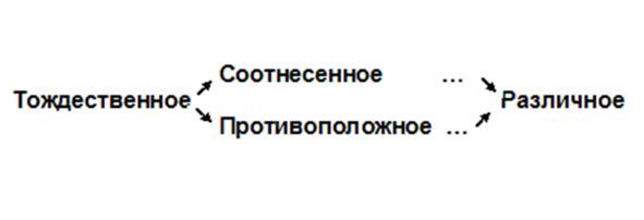 Для того чтобы лучше осмыслить эти понятия, следует разделить один из аристотелевских видов противолежания — «противоречащее» на две части — на два совершенно самостоятельных сравнительных понятия: «Тождественное»: А = А и «Различное»: А и не-А. Тогда как «лишенность и обладание» следует отнести к «соотнесенному» в качестве его частного случая и, именно, в том случае, когда уменьшаясь, меньшая сторона приобретет нулевое значение.