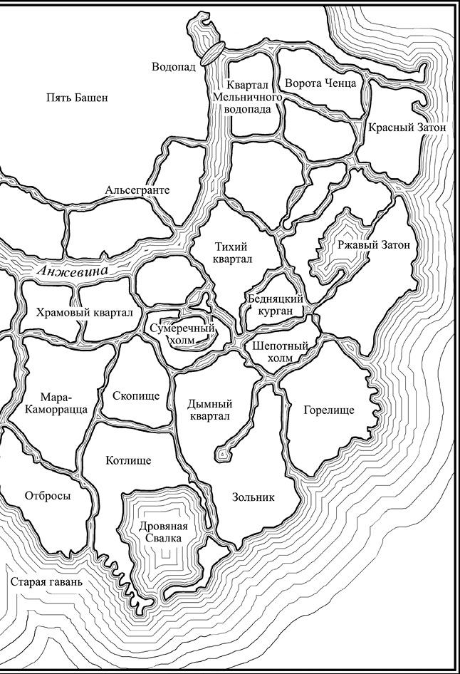 Маленький Ламора со своими товарищами из Горелища впервые вступил в это царство спустя два десятка лет после его основания. Кладбище представляло собой обширное скопление неглубоких старых склепов, соединенных между собой сетью подземных тоннелей и галерей, чьи плотно утрамбованные стены были укреплены частыми опорами, похожими на ребра давно истлевших драконов. Исконных обитателей кладбища уже давно повытаскивали из гробниц и побросали в залив под покровом ночи, и ныне Сумеречный холм превратился в гигантский муравейник, населенный сиротами-воришками.