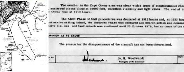 Слева: маршрут движения самолёта Фредди Валентича, восстановленный следственной комиссией с максимальной точностью. Оказалось, что Фредди прервал полёт к острову Кинг и повернул в сторону материка. Во время общения с диспетчером, Валентич ничего не сказал об изменении направления полёта на 180°, зато сообщил, что летает по кругу. Это несоответствие может косвенно указывать на полную дезориентацию пилота в последние минуты полёта. Справа: резюмирующая часть официального доклада, подписанного 27 апреля 1982 г. председателем комиссии Вудвортом.
