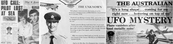 Некоторые из публикаций в австралийской прессе, связанные с исчезновением самолёта Фредди Валентича. История эта наделала в Австралии немало шума и почти сразу же привлекла к себе внимание «исследователей неопознанных летающих объектов». Постепенно это вполне заурядное событие местного значения обрело общемировую известность, без упоминания которого ныне не обходится ни одно более или менее обстоятельное обсуждение любой темы, связанной с НЛО. На крайней левой фотографии можно видеть Гвидо и Ричарда Валентичей, отца и младшего брата Фредерика.