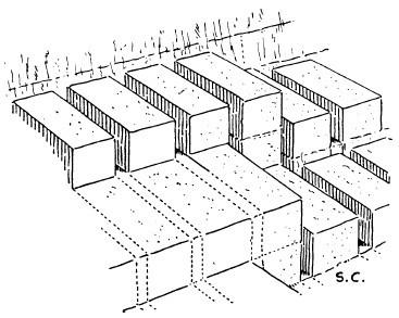 Южнее Кертасси песчаник становится в целом все хуже и хуже, поэтому храмы, которые были построены из него, простояли недолго. В Солебе, например, расположенном между вторым и третьим порогами, находятся руины грандиозного храма Аменхотепа III, который по своим архитектурным особенностям очень похож на храм этого же фараона в Луксоре. Сооружая этот храм из плохого нубийского песчаника, архитектор, должно быть, столкнулся с огромными трудностями – камень совсем не подходил для обычного крупного здания с балочным перекрытием, и оно, вероятно, очень скоро разрушилось. В Гебель-Баркале камень был, вероятно, еще хуже, и здешние храмы сейчас лежат в руинах. Главное различие в способе добычи камня в закрытых и открытых каменоломнях заключалось в том, что в открытых можно было одновременно вырубать большое число блоков на одном уровне, а в закрытых выемка, которая делалась под крышей, редко превышала толщину трех блоков. Когда работы в открытых каменоломнях прекращались, их дно имело ступенчатую форму (рис. 1). В таких каменоломнях на поверхности блоков, которые были предназначены для вырубки, часто делали отметки долотом или красной охрой. Двойная линия, означавшая, где будет проходить разделяющая блоки канавка, имела ширину около 11,25 см.