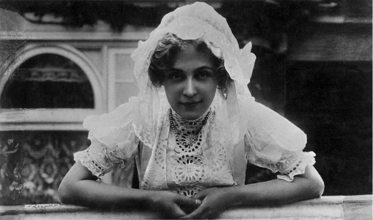«Газ, креп-де-шин, тюль и, главным образом, кружева — вот материал, который берут преимущественно для свадебных, бальных и концертных туалетов. Такого изобилия кружев и прошивок, какие встречаются на современных нарядных и более скромных туалетах, не было уже давно. Можно сказать с достоверностью, что ни одно выездное платье не обходится без большего или меньшего количества тонких или толстых кружев. Их нашивают в виде воланов в несколько рядов с рюшками наверху, обшивают ими оборки из легкой материи, накрепляют кружевные воланы вперемешку с воланами из материй, составляют из широких кружев берты на открытом лифе и кокетку на юбку, вставляют кружевные прошивки в виде инкрустаций в материю, дополняя такую гарнировку цветной шелковой материей. Словом, кружева играют в нарядах дам самую главную роль. И каких только кружев не носят в настоящее время! Первое место из всей этой кружевной моды занимают, бесспорно, кружева шпахтель, шантилийское кружево, алансонское, клюни и гипюр, а затем уже идет филейное кружево и подделка кружев reticella. Из черных филейных кружев делают целые блузочки на цветной шелковой подкладке. Гипюровые кружева цвета экрю и café au lait с черным узором берут для гарнировки черных платьев. Целые кружевные платья черного, белого, крем и экрю цвета надевают на цветные шелковые чехлы. Такой туалет идет для выездов в театр, на вечер, на бал и на свадьбу. В большой моде четырехугольники и шары из кружев и тюля с нашитыми на них золотыми или серебряными нитками и блестками; чрезвычайно эффектны розетки из блесток цвета слоновой кости, серого цвета дыма, золотистого и серебристого цвета. По краям таких розеток накрепляют серебряные или золотые блестки, а посередине — жемчужину. Модными считаются каемки, галуны и канты из золота. Принято отделывать бальные туалеты кружевами одного цвета с туалетом; очень эффектны светло-серые, голубые нежного оттенка, лиловые и розовые кружева. Встречается даже красное шантилийское кружево. В виду таких гарнировок бальный туалет отличается чрезвычайным изяществом и очень наряден». Текст: Новые моды. Париж, Берлин, Вена // Модный свет. 1903. № 46. С. 503. Фото: Pauline Chase