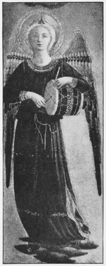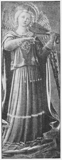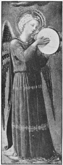 Long ago the good brothers of San Marco were sent away and the doors thrown wide to the public, who now call it the Museum of San Marco. Easel pictures have been gathered here to swell the number of Angelico's works in the place that was so long his home. One of these is a small copy, made by the artist, of what is known to us as the "Tabernacle Madonna" which is in the Uffizi gallery in Florence. The glory of this work is not in the Madonna or the child she holds but, strange to say, in the frame which encloses the picture. A broad band of smooth gold intervenes between the outer and inner molding of the frame and in this space are painted the twelve angels playing various musical instruments, which are so familiar to us to-day.