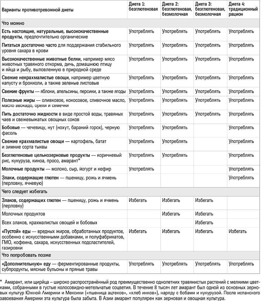 В этом разделе представлен обзор четырех противотревожных диет, которые я считаю эффективными, с подробными данными обо всех продуктах, которые следует включать и избегать, а также о поощрительных продуктах, которые вы сможете попробовать позже, как только сформируете хорошую основу для собственной противотревожной диеты. При поиске такой оптимальной диеты вполне допустимо идти экспериментальным путем, методом проб и ошибок. Последовательность, которую я в общих чертах обрисовала ниже, обеспечивает методический подход, который поможет вам определить, есть ли у вас непереносимость каких-либо распространенных продуктов, которая может провоцировать тревожность.