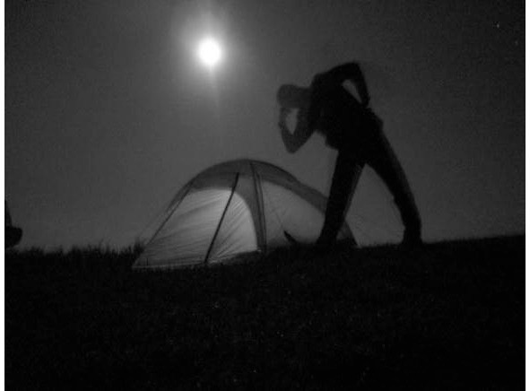 Ночь была тихой и вдруг мы проснулись от звуков шагов возле палатки. Кто-то еле слышно ходил, затем мы услышали тяжёлое дыхание, какое-то бормотание, потом возня возле примуса и удаляющиеся шаги. Ужас охватил нас, и мы лежали не шевелясь.