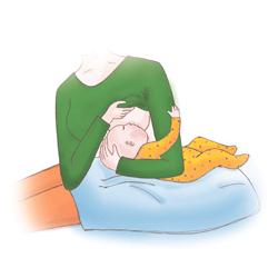 - Положите ребенка себе на колени: пока вы только учитесь кормить грудью, так вам будет удобнее. Положите себе под спину подушку, чтобы чувствовать себя комфортно. Другую подушку подложите себе на колени под ребенка: пока он еще очень маленький, и она поможет ему находиться на уровне груди.